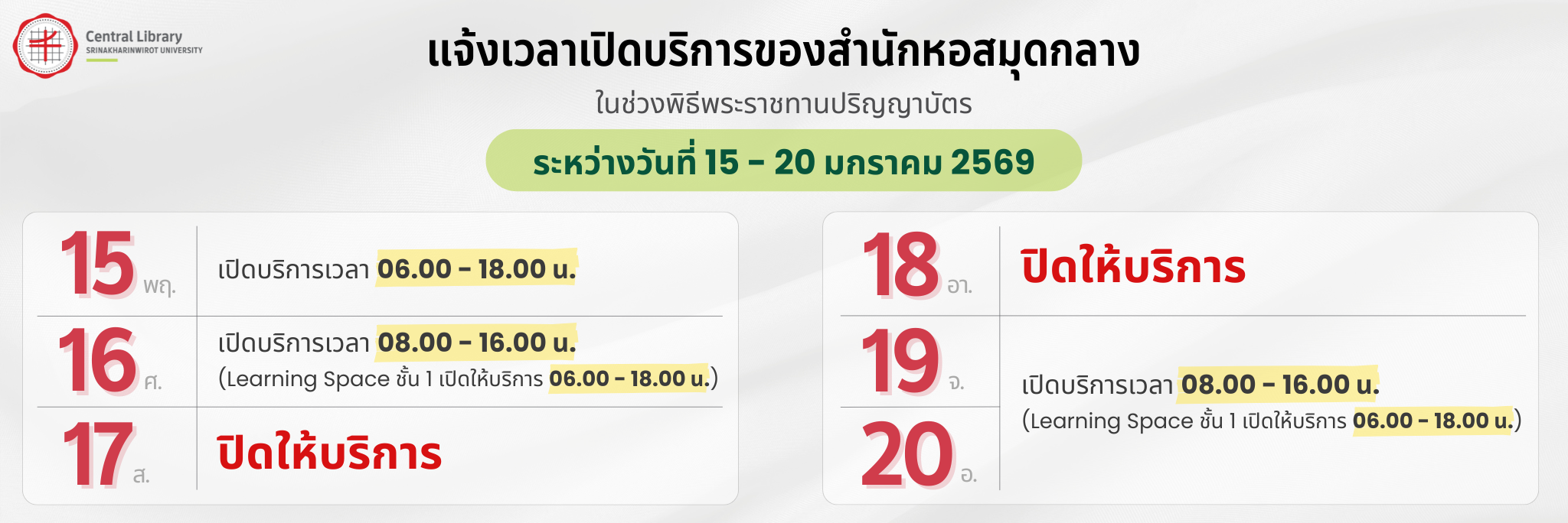📢 ประกาศแจ้งเวลาเปิดให้บริการในช่วงรับปริญญาบัตร (ระหว่างวันที่ 15-20 ม.ค. 69)
