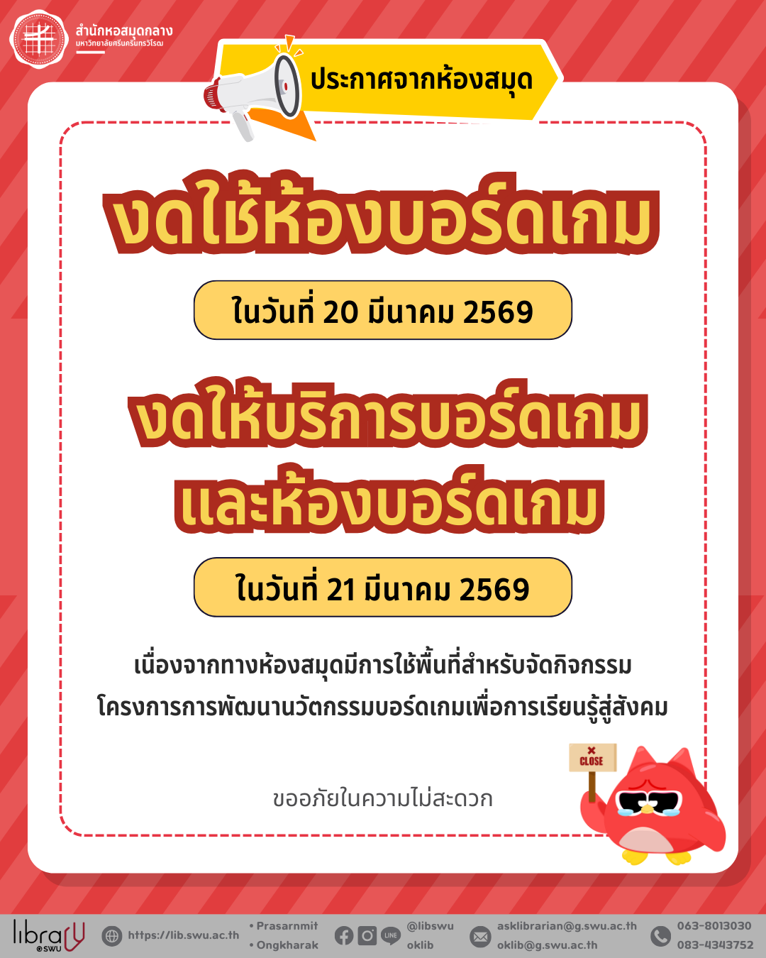 🚫 ห้องสมุดปิดบริการวันหยุดนักขัตฤกษ์ (ดูเพิ่มเติม)