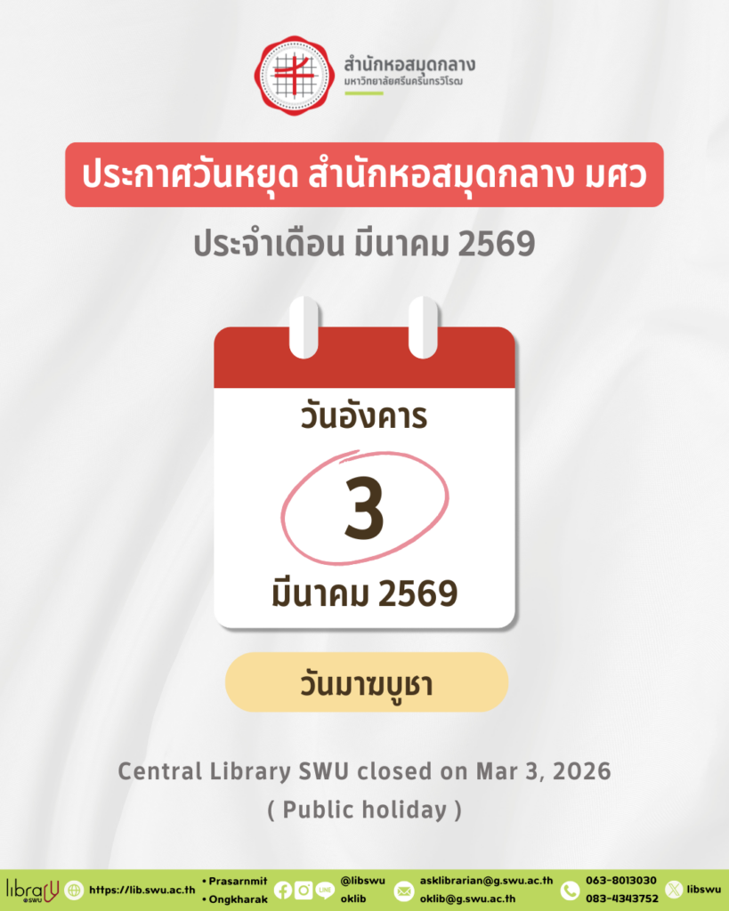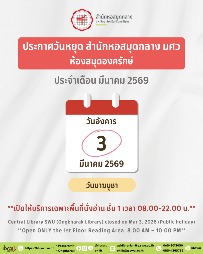 ประกาศวันหยุดประจำเดือนมีนาคม 2569 สำนักหอสมุดกลาง มศว และ ห้องสมุดองครักษ์