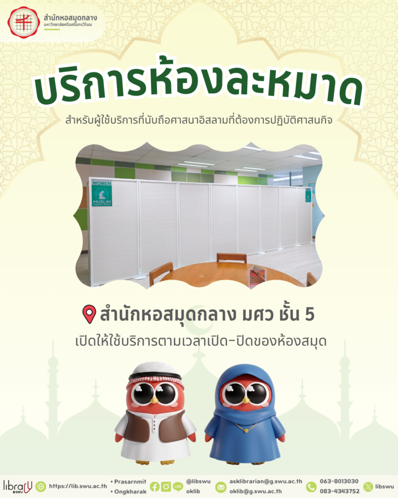 สำนักหอสมุดกลาง มศว เปิดให้บริการ “ห้องละหมาด” เพื่ออำนวยความสะดวกสำหรับผู้ใช้บริการที่นับถือศาสนาอิสลาม ที่ต้องการปฏิบัติศาสนกิจ