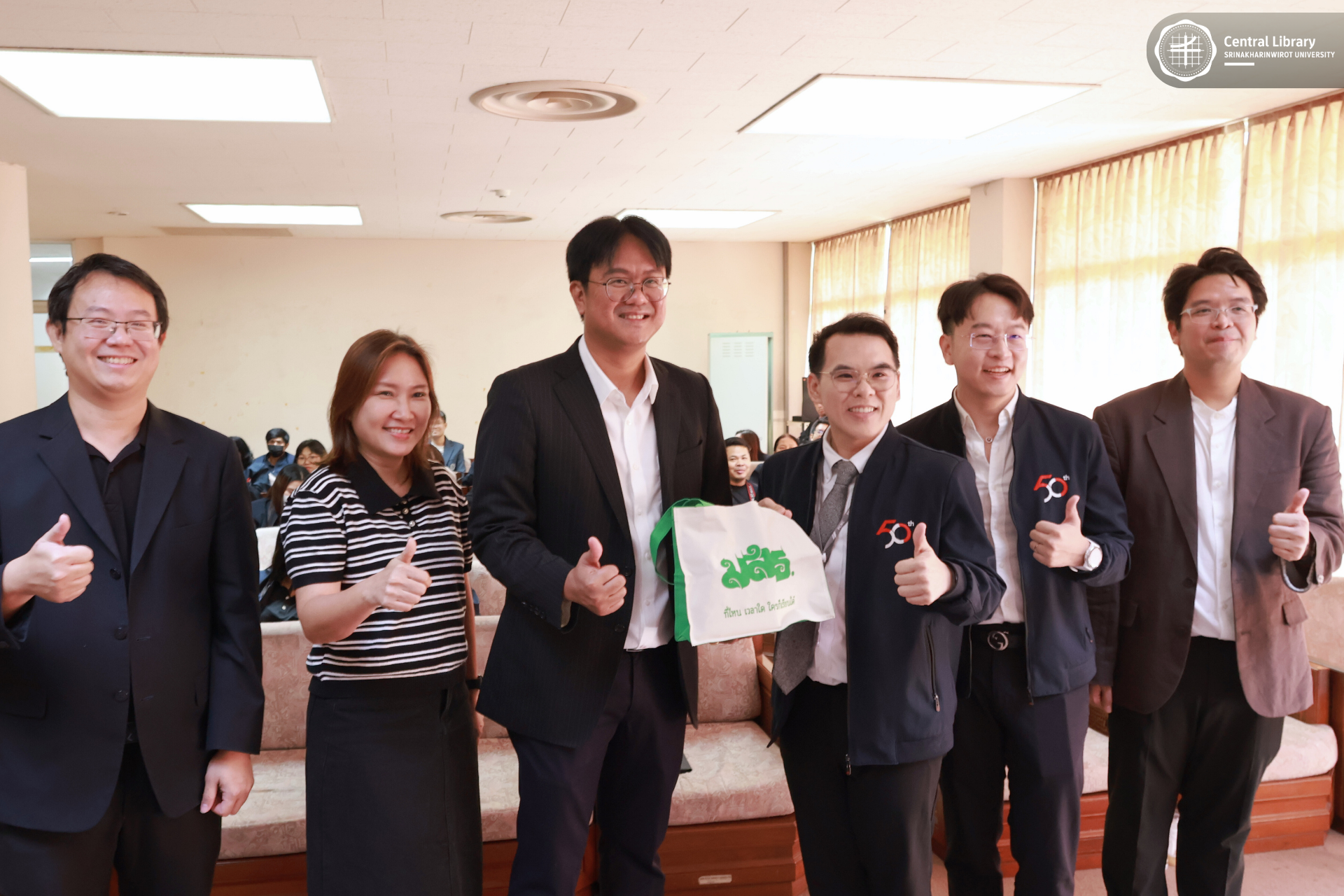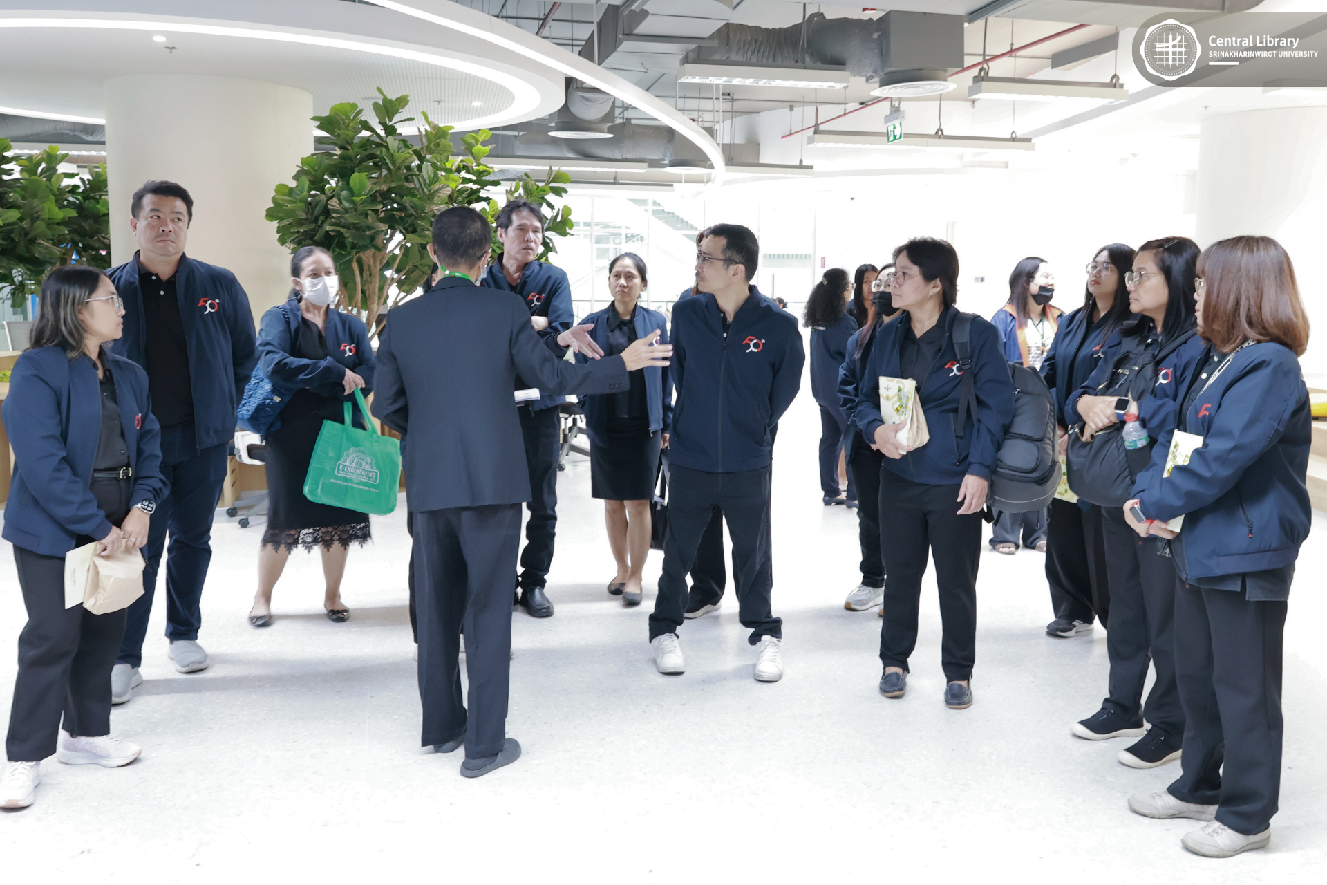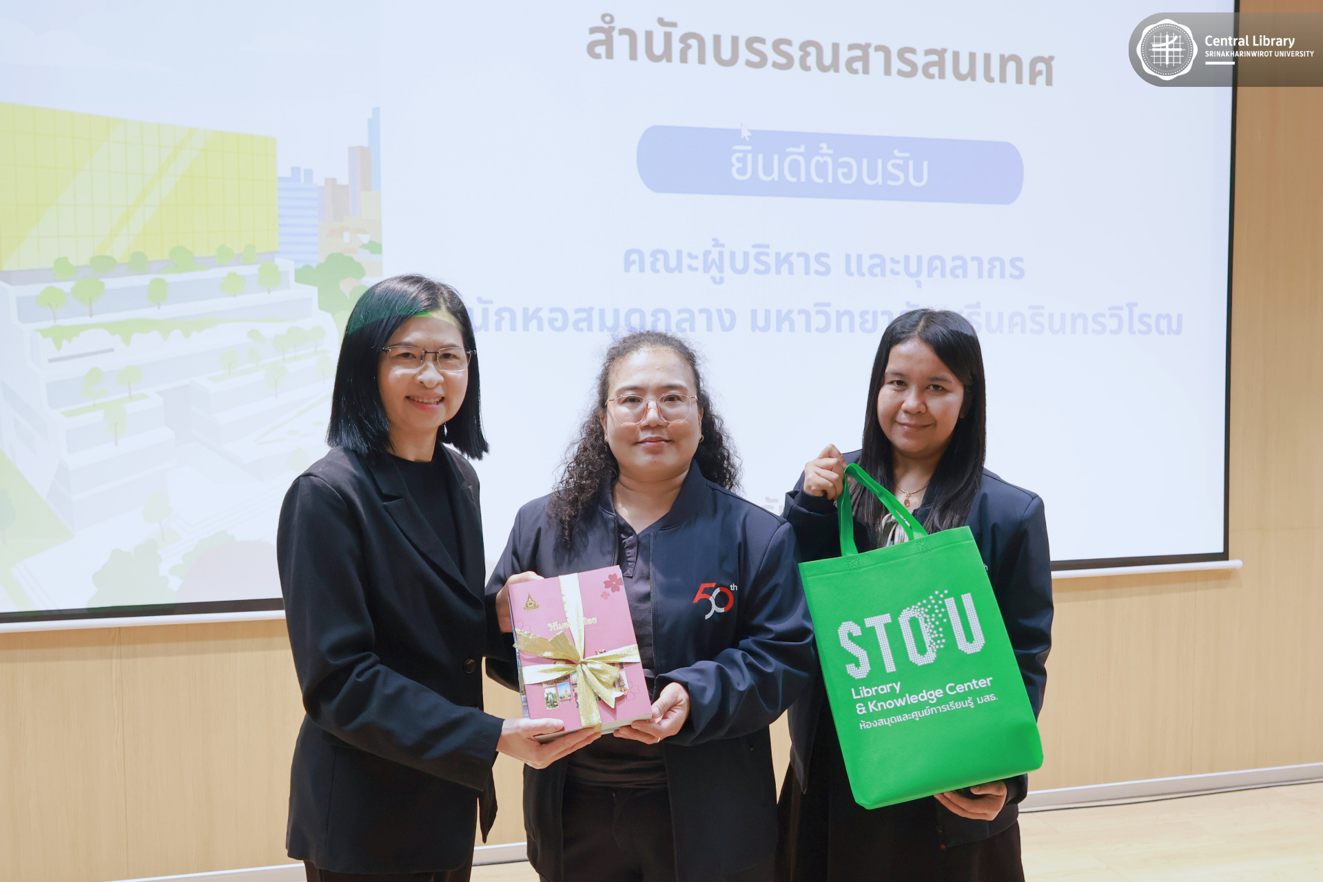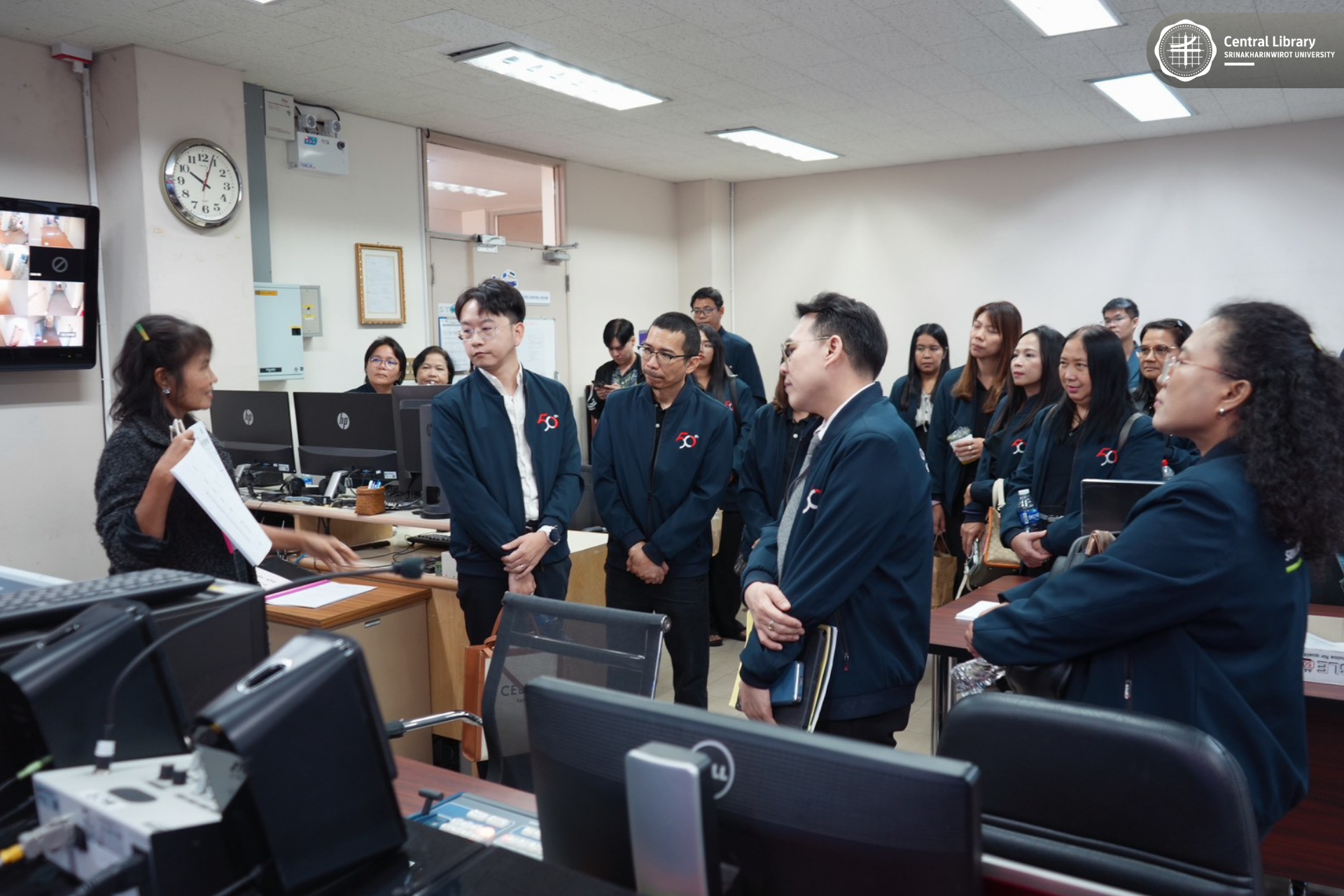 ในการนี้ สำนักหอสมุดกลาง มศว นำโดย ผศ.นพ.วรพล อร่ามรัศมีกุล ผู้อำนวยการสำนักหอสมุดกลาง พร้อมด้วย ผศ.อธิป เตชะพงศธรร รองผู้อำนวยการฝ่ายสื่อสารองค์กรและเทคโนโลยีดิจิทัล และบุคลากรห้องสมุด