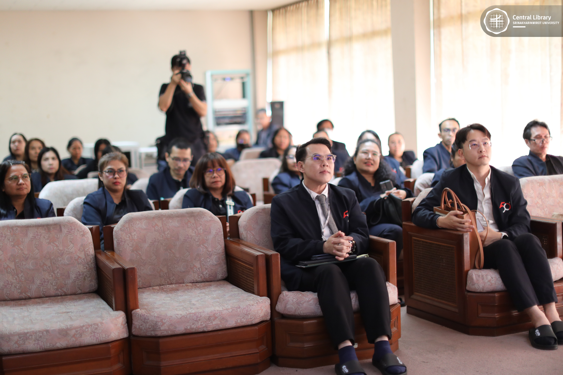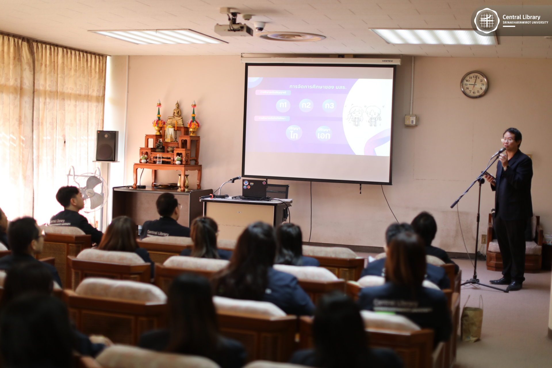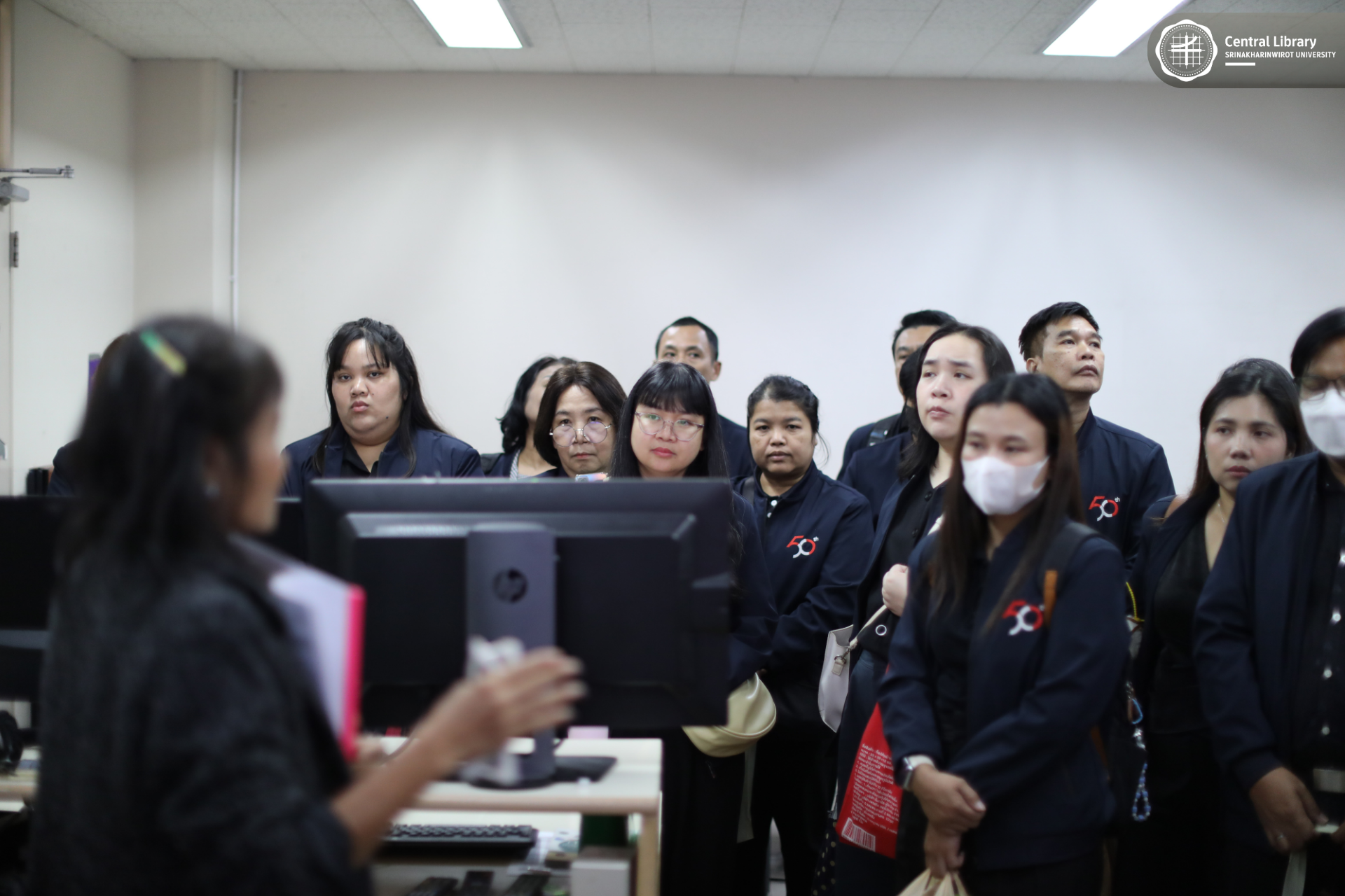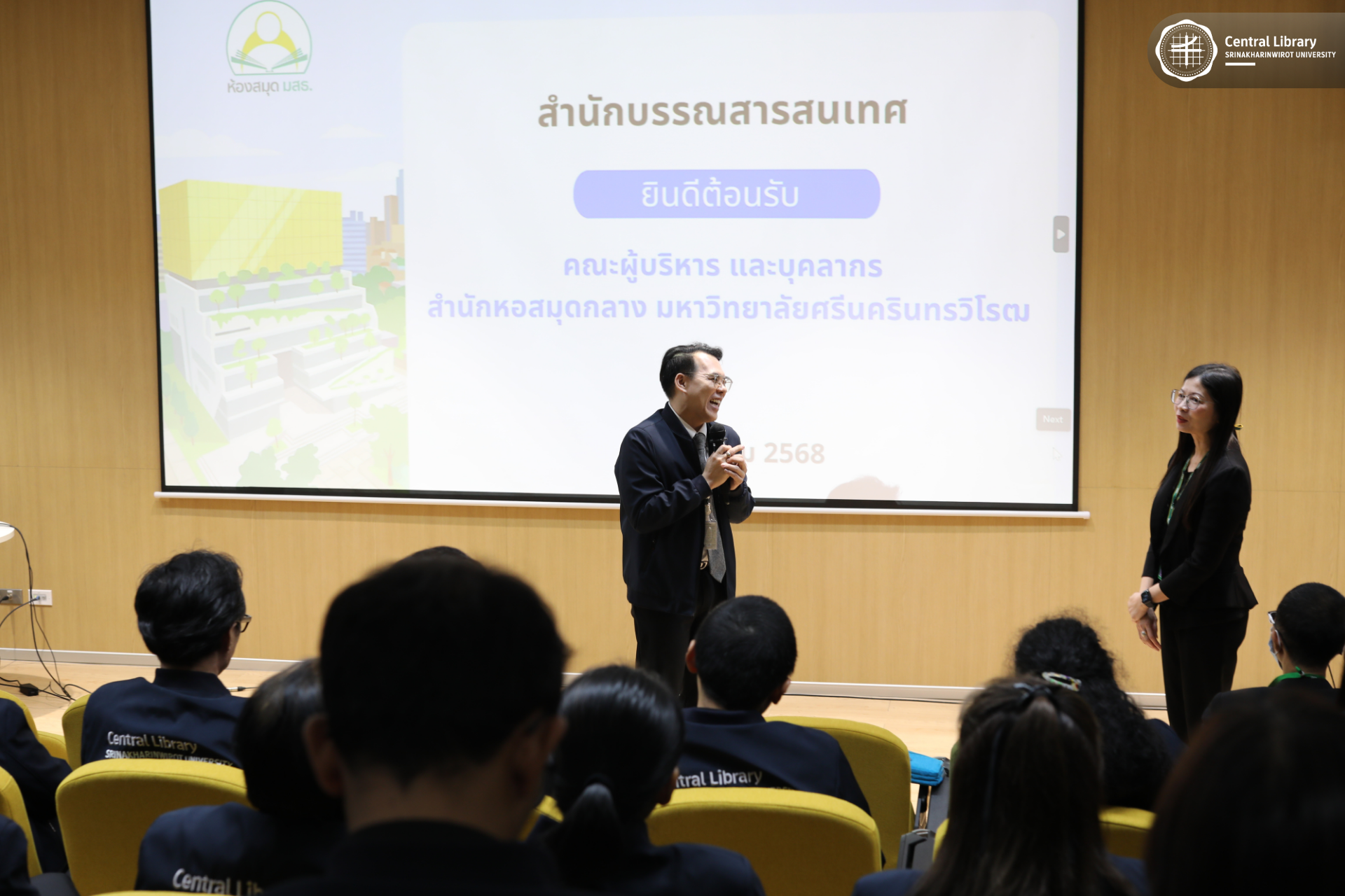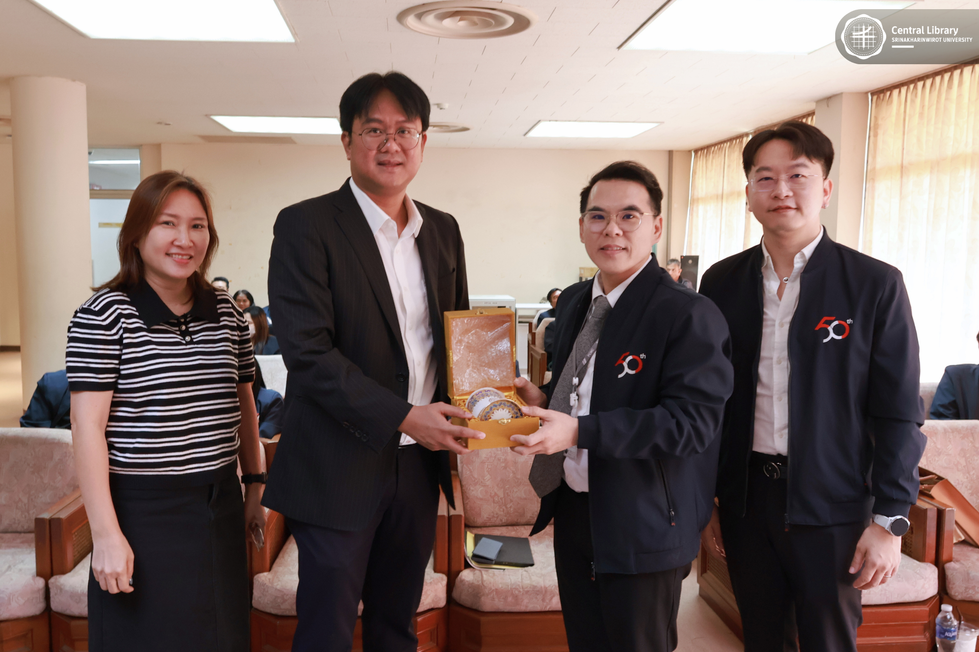 ในการนี้ สำนักหอสมุดกลาง มศว นำโดย ผศ.นพ.วรพล อร่ามรัศมีกุล ผู้อำนวยการสำนักหอสมุดกลาง พร้อมด้วย ผศ.อธิป เตชะพงศธรร รองผู้อำนวยการฝ่ายสื่อสารองค์กรและเทคโนโลยีดิจิทัล และบุคลากรห้องสมุด
