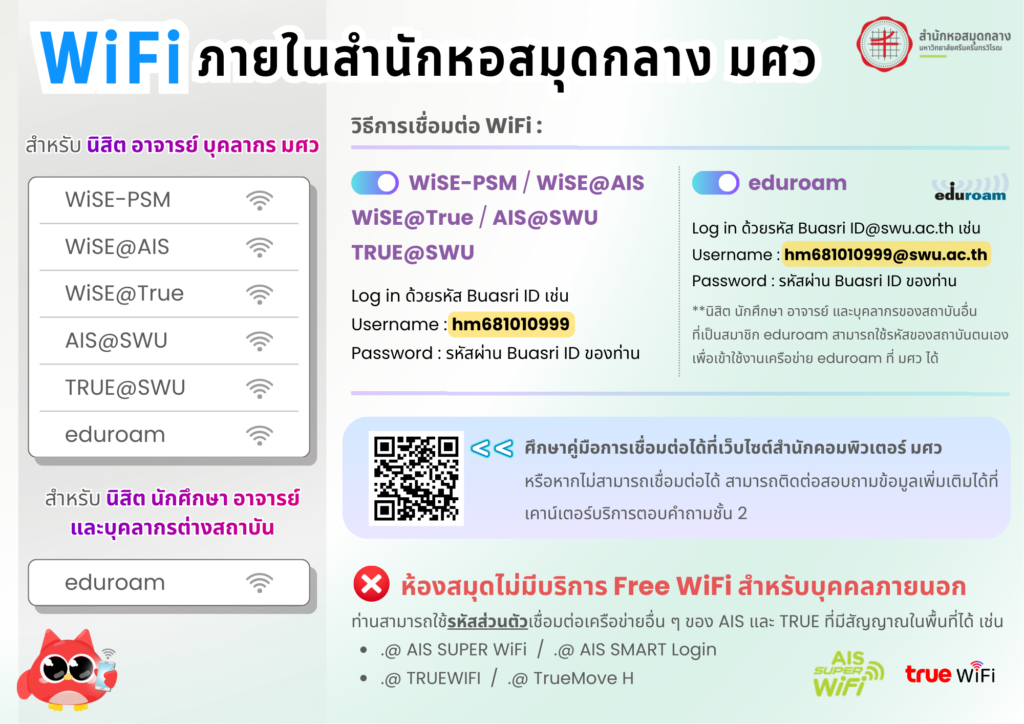 – ประสานมิตร : WiSE-PSM / WiSE@AIS / WiSE@True / AIS@SWU / TRUE@SWU / eduroam