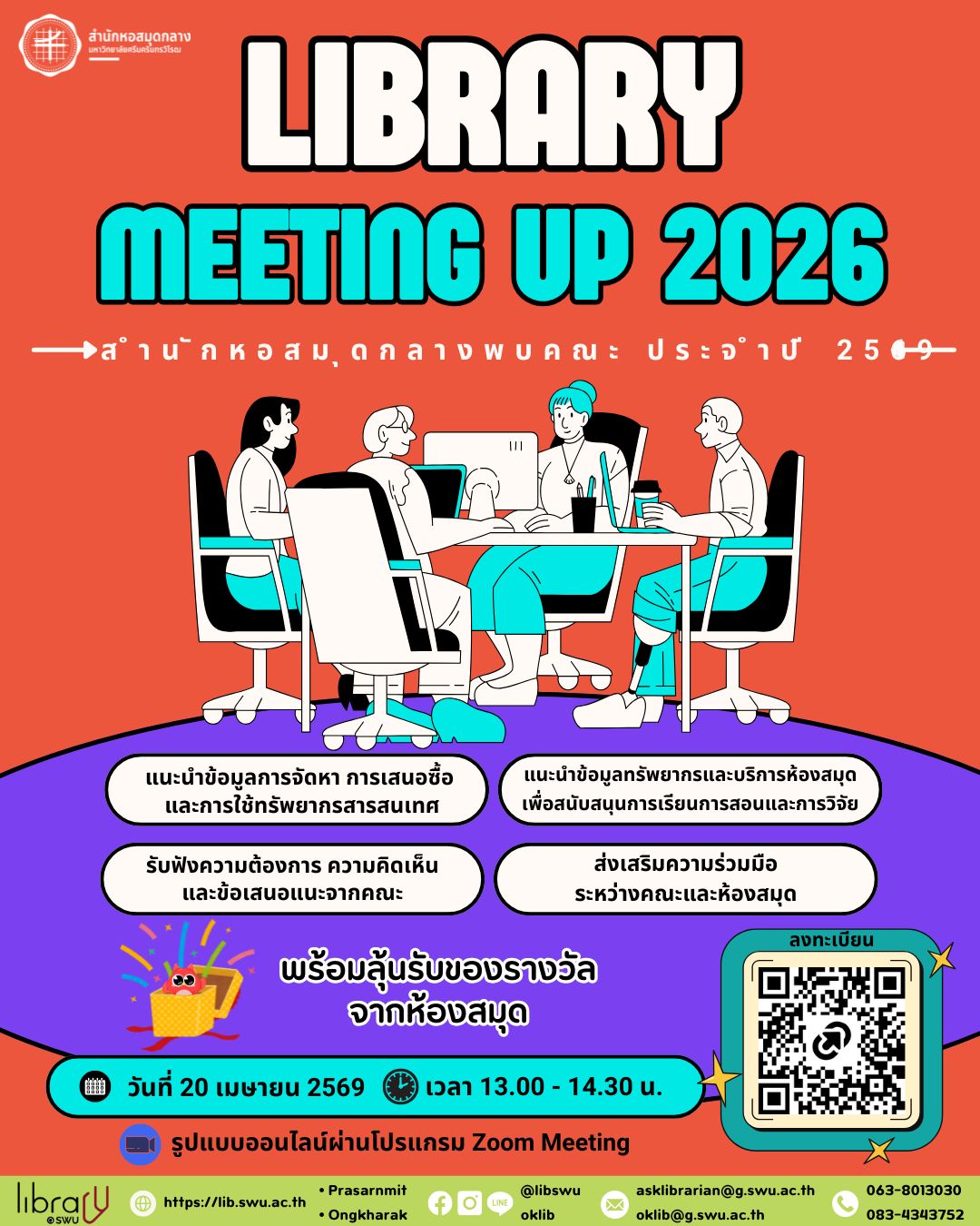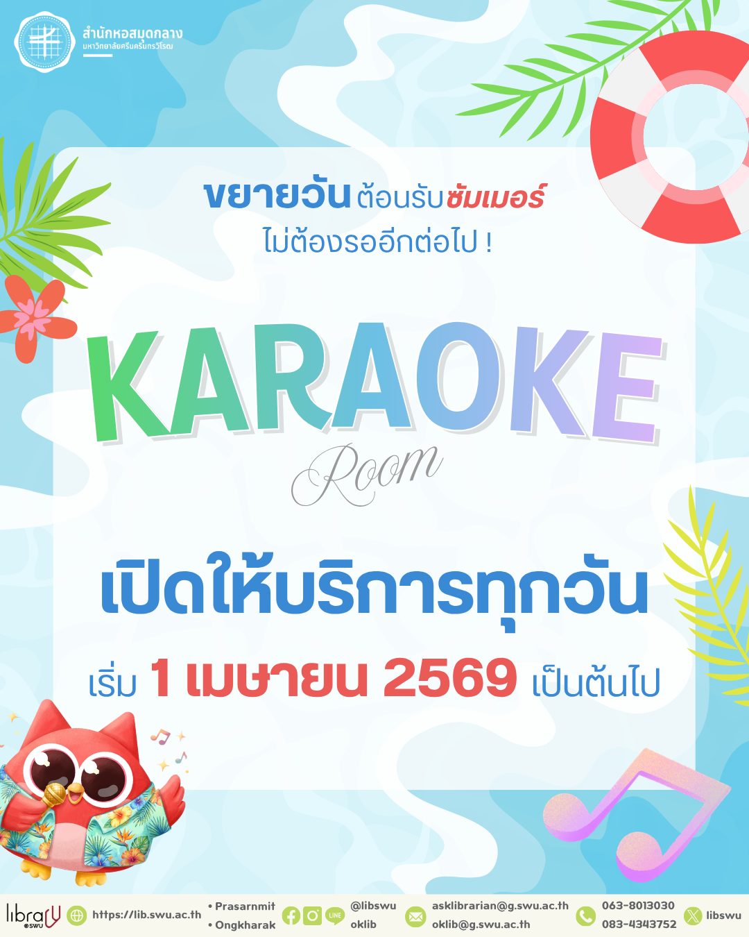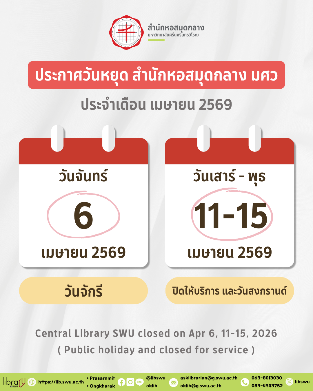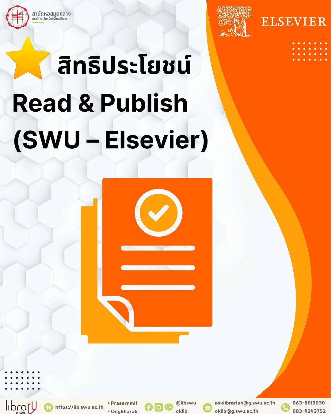 อีเมล : oklib@g.swu.ac.th, asklibrarian@g.swu.ac.th