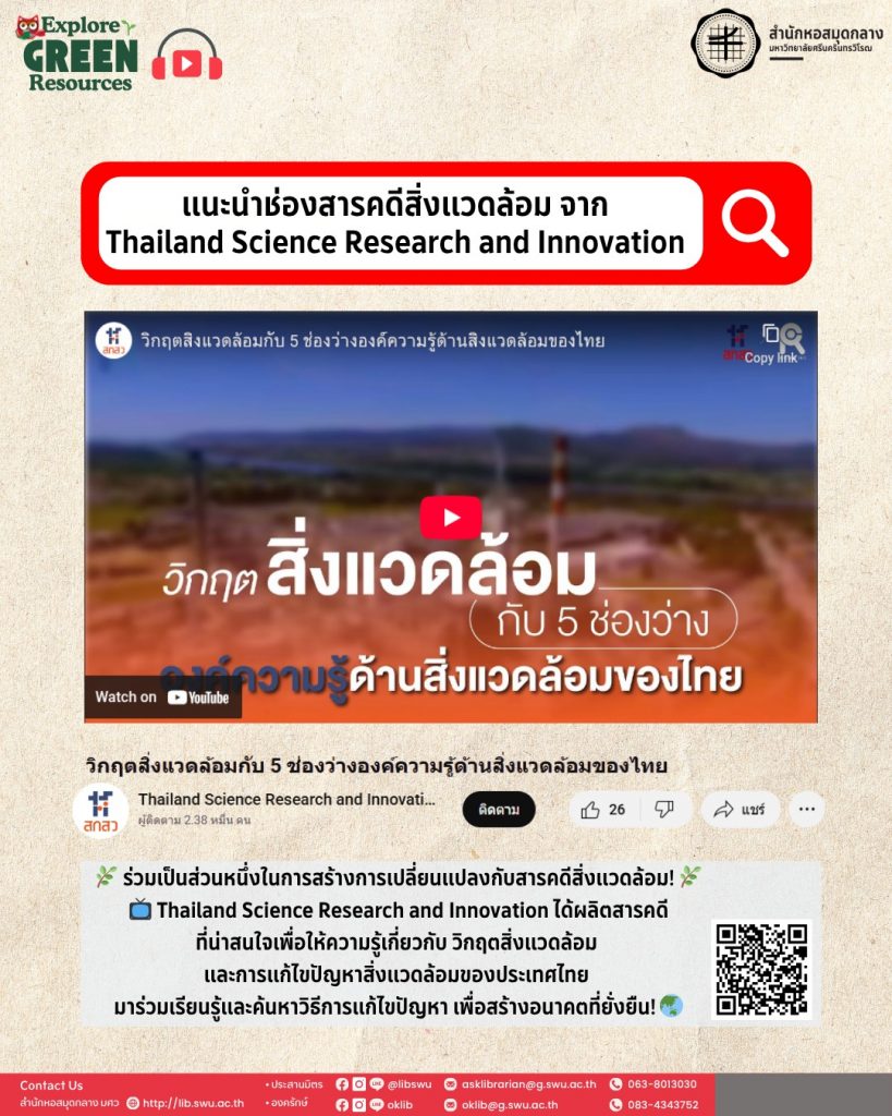 Youtube : วิกฤตสิ่งแวดล้อมกับ 5 ช่องว่างองค์ความรู้ด้านสิ่งแวดล้อมของไทย