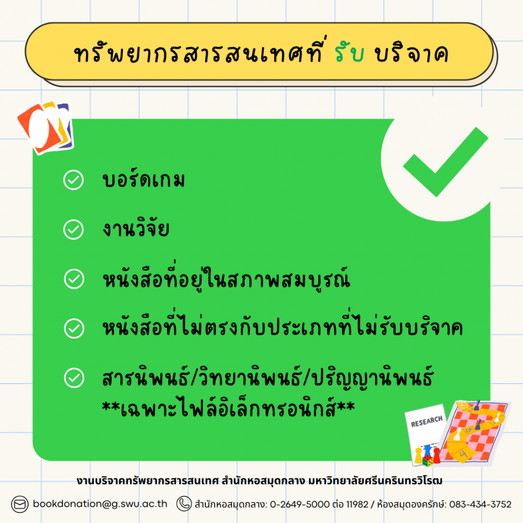 หมายเหตุ : ทรัพยากรสารสนเทศที่ได้รับบริจาคถือเป็นกรรมสิทธิ์ของสำนักหอสมุดกลาง มหาวิทยาลัยศรีนครินทรวิโรฒ ในกรณีที่ทรัพยากรสารสนเทศไม่ตรงกับนโยบายการจัดหาของสำนักหอสมุดฯ หรือไม่สอดคล้องกับหลักสูตรการเรียนการสอนของมหาวิทยาลัย สำนักหอสมุดฯ ขอสงวนสิทธิ์ในการพิจารณานำเข้า และสามารถดำเนินการต่าง ๆ เพื่อประโยชน์ทางการศึกษาได้ตามความเหมาะสม โดยไม่ต้องแจ้งให้ผู้บริจาคทราบล่วงหน้า