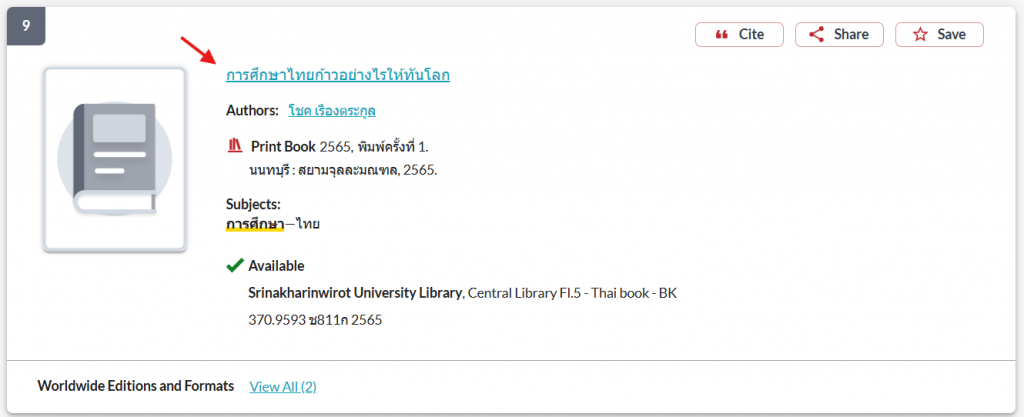 เมื่อพบรายการหนังสือที่ต้องการ ‘คลิก’ ที่ชื่อหนังสือ เพื่อเข้าไปตรวจสอบเลข OCLC Number