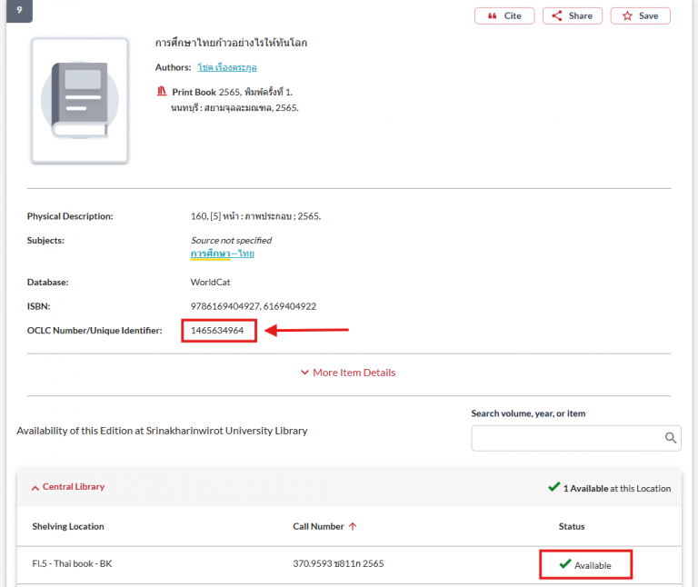 3. ทำการคัดลอกข้อมูลเลข “OCLC Number” ของหนังสือเล่มที่ต้องการ ทั้งนี้โปรดตรวจสอบสถานะของหนังสือที่สามารถทำรายการผ่านระบบ SWU Lib Delivery ได้ จะต้องมีสถานะ ‘ Available ‘ เท่านั้น