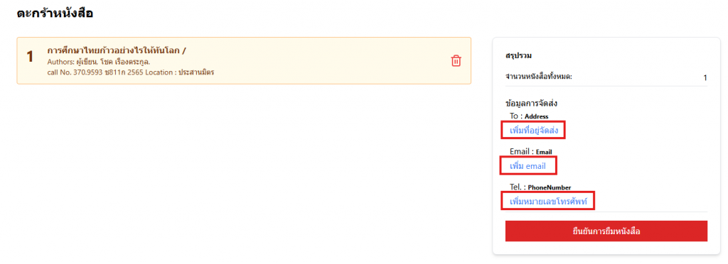 6. คลิกที่ไอคอน ‘ตะกร้า’ เพื่อตรวจสอบรายการหนังสือที่ต้องการยืม และใส่ข้อมูลดังต่อไปนี้